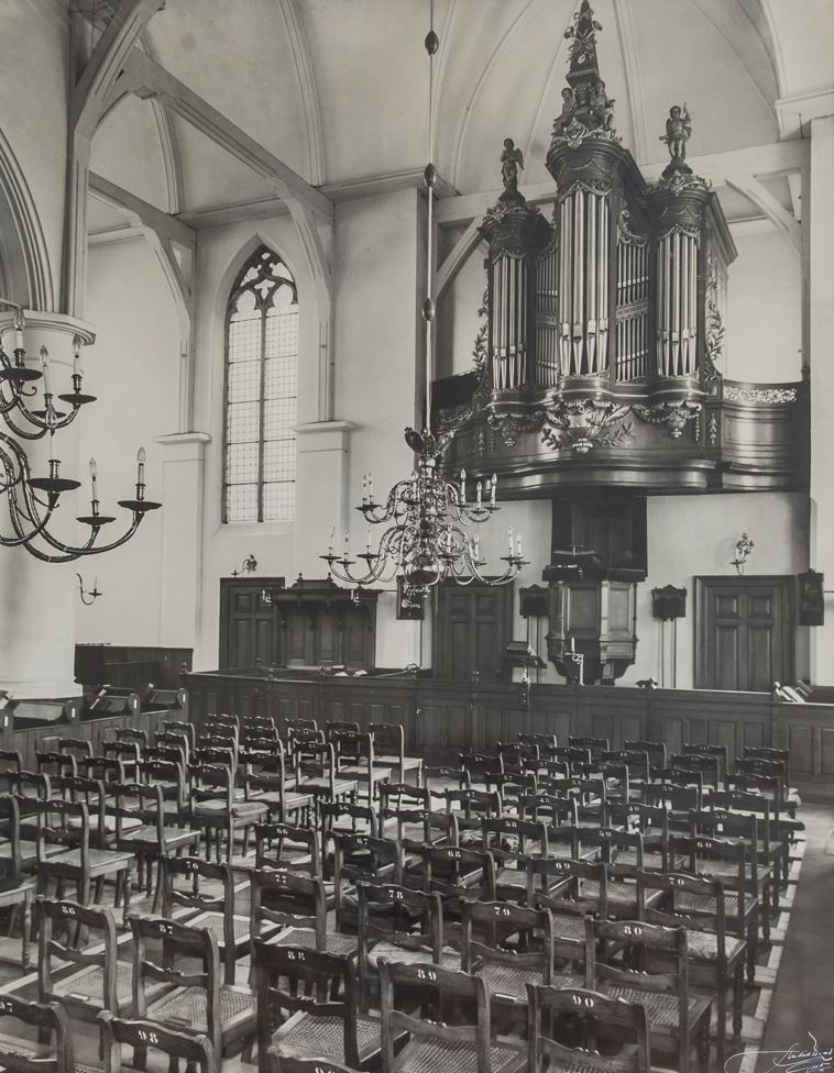 Het interieur in het begin van de twintigste eeuw, met het orgel aan de oostzijde, op de plek van het vroegere koor.